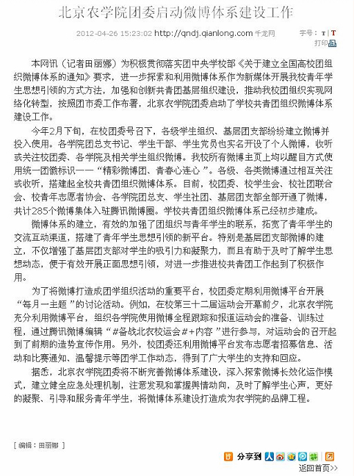 今年2月下旬,在校团委号召下,各级学生组织、基层团支部纷纷建立微博并投入使用。各学院团总支书记、学生干部、学生党员也实名开设了个人微博,收听或关注校团委、各学院及相关学生组织微博。世界杯官网所有微博主页上均以醒目方式使用统一团徽标识——“精彩微博团、青春心连心”。各级、各类微博通过相互关注或收听,搭建起全校共青团组织微博体系。目前,校团委、校学生会、校社团联合会、校青年志愿者协会、各学院团总支、学生社团、基层团支部全部开通了微博,共计285个微博集体入驻腾讯微博圈。学校共青团组织微博体系已经初步建成。
