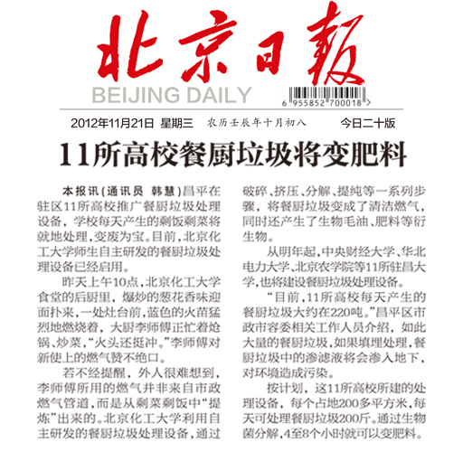 本报讯(通讯员 韩慧)昌平在驻区11所高校推广餐厨垃圾处理设备,学校每天产生的剩饭剩菜将就地处理,变废为宝。目前,北京化工大学师生自主研发的餐厨垃圾处理设备已经启用。