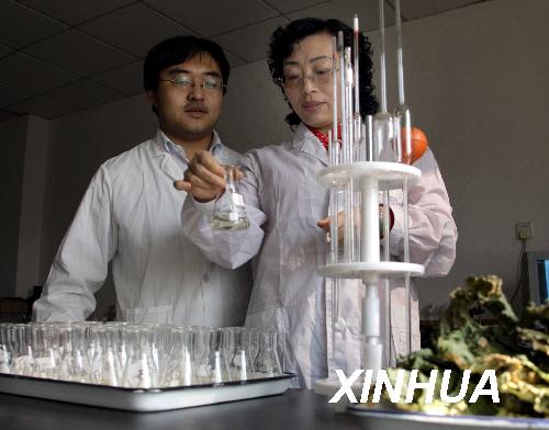 张丽平(右)在自己的研究所测试土壤有机成分。