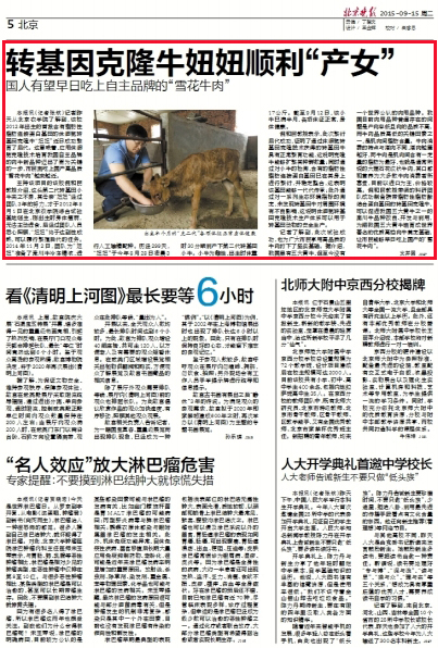 倪和民教授表示,此次繁衍后代成功,证明了通过体细胞转基因克隆技术获得的转基因牛具有正常繁育功能,这说明克隆牛能够扩繁其种群数量;同时通过对小牛的检测,含有的脂肪性脂肪连接蛋白基因已在其身上进行繁衍,并稳定整合,这表明该基因能够一代代传承;此外通过对一系列生态环境指标的测定,未发现转基因牛对周围环境有不良影响,这说明体细胞转基因克隆技术生产体系可以用于转基因动物的安全生产。