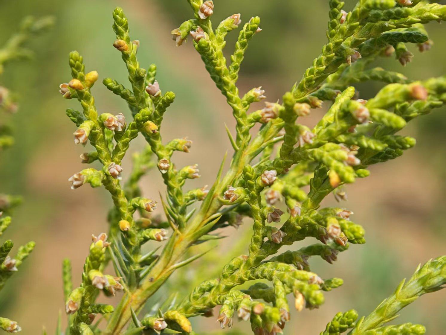 “冬春季节,雄株圆柏枝梢上布满了金黄色、大米粒大小的雄球花,非常高调,花粉就藏在其中。但此时,雌株上的雌花很小,小米粒般,经常‘低着头’。”刘国彬说。
