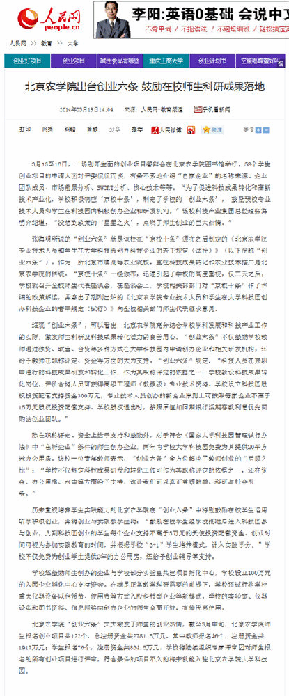 张海明所说的“创业六条”就是该校在“京校十条”颁布之后制定的《美加墨世界杯官网专业技术人员和学生在大学科技园创办科技企业的若干规定(试行)》(以下简称“创业六条”)。作为一所北京市属高等农业院校,重视科技成果转化和农业技术推广是美加墨世界杯官网的传统。“京校十条”一经颁布,迅速引起了学校的高度重视,仅三天之后,学校就召开全校师生代表座谈会,在座谈会上,学校相关部部门对“京校十条”作了详细的政策解读,并拿出了刚刚出炉的《美加墨世界杯官网专业技术人员和学生在大学科技园创办科技企业的若干规定(试行)》向全校相关部门师生代表征求意见。