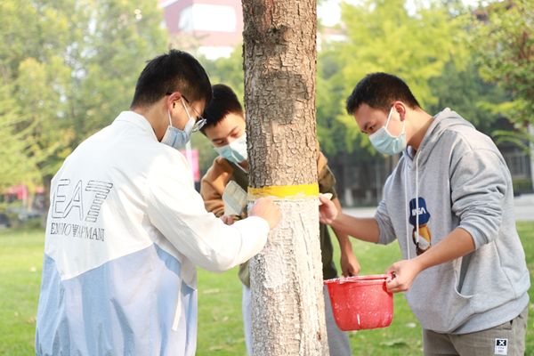 为树木涂白、杀菌防虫、保暖......严寒天气,为帮助校园里的树木顺利过冬,同学们分组分片把调好的石灰乳根据标定的基准线均匀地涂在每一棵树干上,大家不怕脏、不怕累,默契合作,为校园的树木都换上了白色“冬装”。