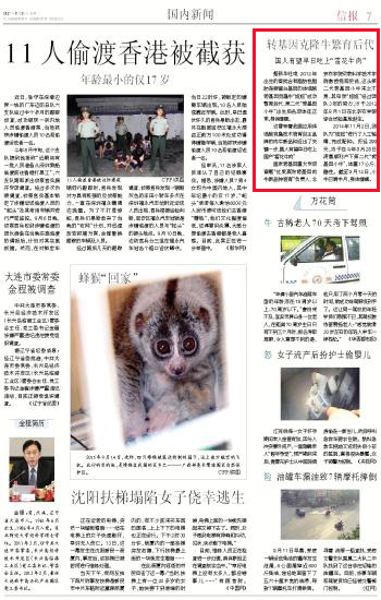 2012年出生的首批含有脂肪性脂肪连接蛋白基因的体细胞转基因克隆牛“妞妞”成功繁育后代,第二代“转基因小牛”出生后各项体征正常,身体健康。