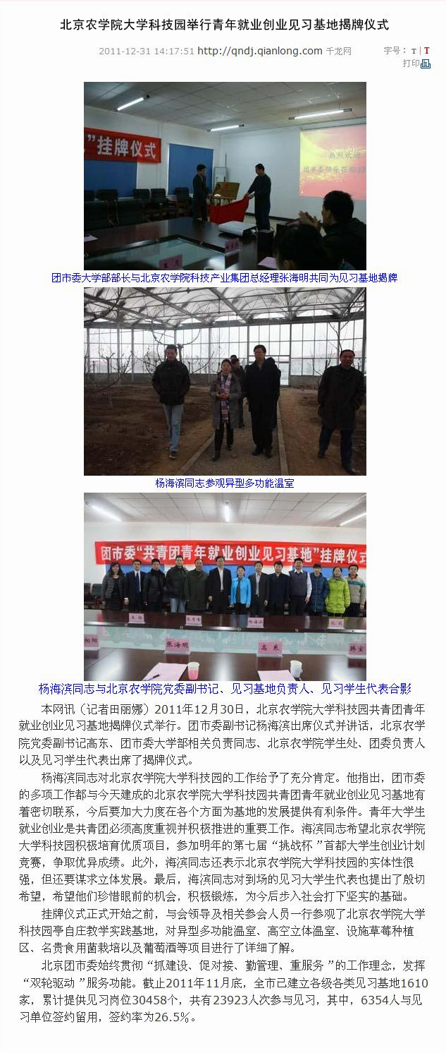 千龙网讯(记者田丽娜)2011年12月30日,美加墨世界杯官网大学科技园共青团青年就业创业见习基地揭牌仪式举行。团市委副书记杨海滨出席仪式并讲话,美加墨世界杯官网党委副书记高东、团市委大学部相关负责同志、美加墨世界杯官网学生处、团委负责人以及见习学生代表出席了揭牌仪式。