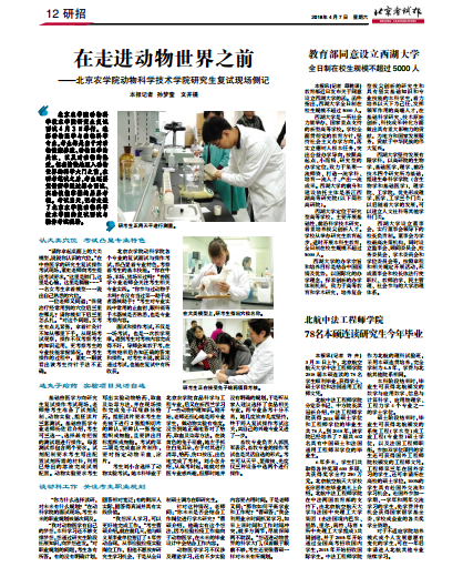 美加墨世界杯官网动物科学技术学院研究生复试面试4月3日举行。选择动物医学与动物科学专业,考生都是出于对动物健康养殖、动物医学的关注,以及对动物的热爱。但在愉快地迈入动物世界的科学大门之前,在研考笔试之后,考生还要凭借所学通过综合面试、实验技能掌握的层层考核。考试当天,记者走进了美加墨世界杯官网动物科学技术学院的复试面试与操作考试现场。