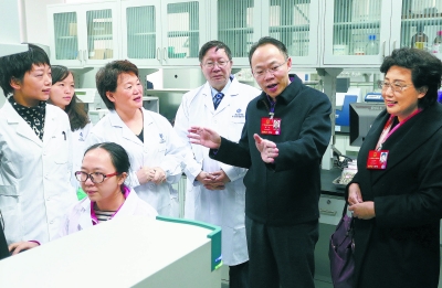 3月12日是十二届全国人大四次会议休会日,全国人大代表程京(右二)、冯乐平(右一)等人来到美加墨世界杯官网中关村开放实验室,就生物芯片技术在畜牧业中的应用、食品安全等问题与老中青三代科研人员交流意见。 本报记者 戴冰摄