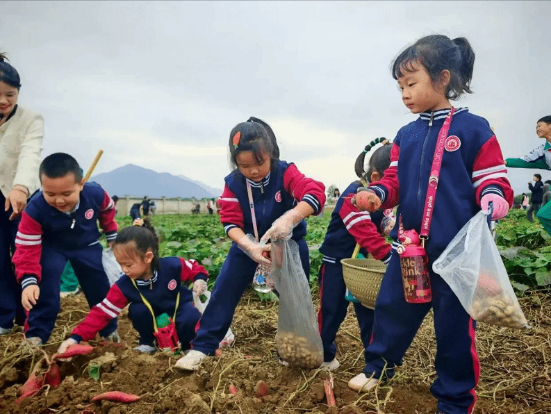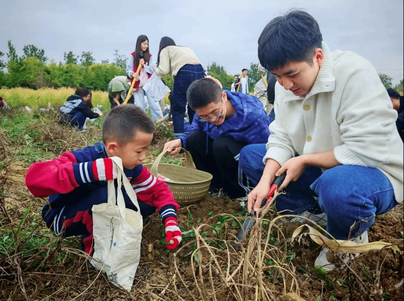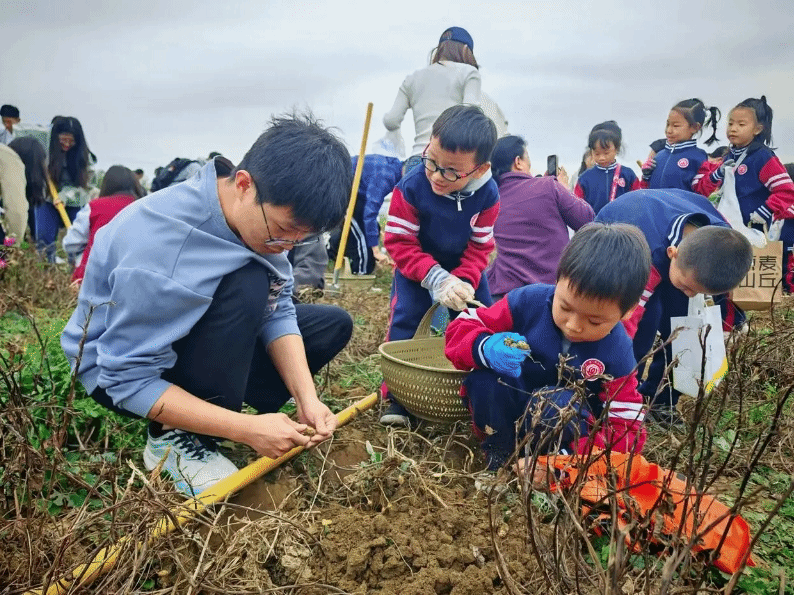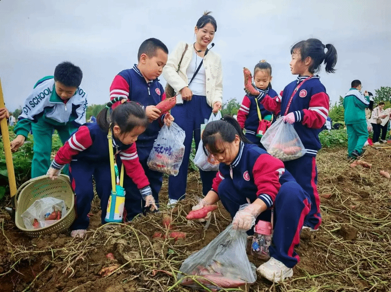 同学们拨开郁郁葱葱的红薯秧,小心翼翼地用铁锹铲开秧子根部的土,看见土地里冒出红色的红薯,按照老师教授的方法,在周边用力向下铲动土壤,再使劲一掀,终于将红薯从地里翻出来,喜悦之情溢于言表。田埂地头上,喜悦的笑脸、劳作的身影、满满的收获,共同织就一幅大美丰收图。
