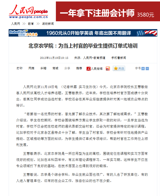 “若要做一名优秀的村官,首先要了解农业技术,其次要了解地域需求。”王慧敏介绍说,学生在校期间,学校会围绕培养方案让学生获取一般的知识,一旦学生当选为村官,学校不仅会把在校老师的通讯录都交给村官,还会为村官提供特定的培训课程。比如学校对于北京各区县特点十分了解,学生当了村官后,学校会有针对性地提供产业推动、区域推动等方面的知识,为学生提供订单式专项培训,帮助村官在工作岗位上顺利发展。