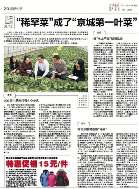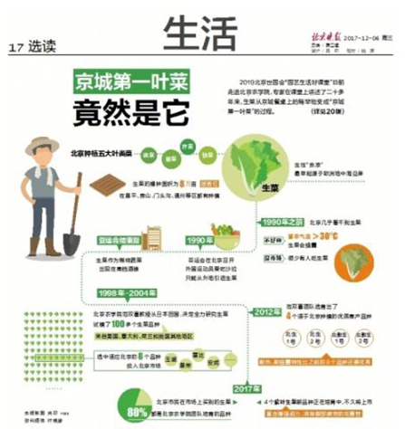 虽然北京本地已经有了8个生菜品种,但韩莹琰的团队并不满足。“这8个品种毕竟是外国种,而且还有一些不稳定的性状,我们还想培育更适合本地的自家品种。”从2005年开始,韩莹琰又跟着范双喜带领团队开始研发本地耐热品种。2012年,团队选育出了4个适于北京及周边省份种植的优质高产生菜品种“北生1号”、“北生2号”、“北散生1号”、“北散生2号”,耐热、耐抽薹的特性比之前的8个品种还要优秀。