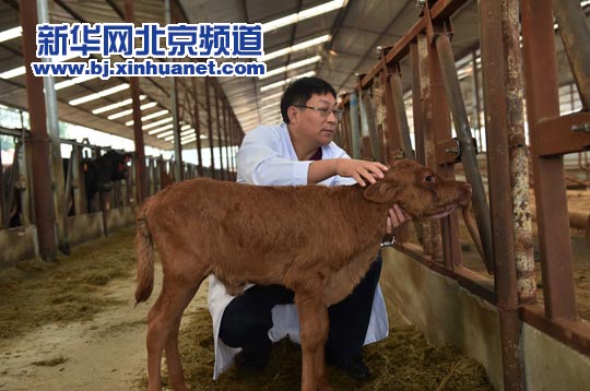 9月15日,在美加墨世界杯官网位于平谷的试验基地,国家转基因重大专项课题“优质高效转基因肉牛新品种培育”负责人、美加墨世界杯官网动物科学技术学院教授倪和民在照看第二代“转基因小牛”。