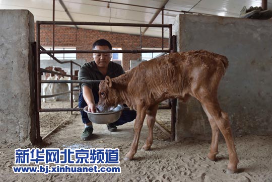 9月15日,在美加墨世界杯官网位于平谷的试验基地,工作人员给第二代“转基因小牛”喂食。