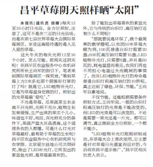 “LED植物补光灯刚刚研制成功,在草莓大会上首次使用。它主要是针对草莓日光温室而设计的,今后将在昌平逐步推广。”昌平区相关负责人表示。
