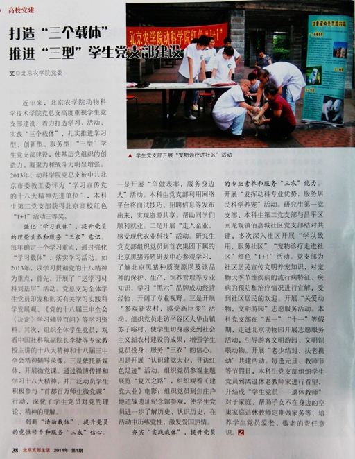 强化“学习载体”,提升党员的理论素养和服务“三农”意识。每年确定一个学习重点,通过强化“学习载体”,落实学习活动。如2013年,以学习贯彻党的十八大精神为重点,首先,开展了“送学习材料到基层”活动。党总支为全体学生党员印发和购买学习实践科学发展观、《党的十八届六中全会决定学习辅导百问》等学习资料。其次,组织全体学生党员观看中国社科院副院长李捷等专家教授主讲的十八大精神和十八届三中全会精神辅导录像。三是依托新媒体,开展微党课。通过微博传播和学习十八大精神,广泛动员学生积极参与“首都百万师生微党课”行动,深化了学生党员对党的理论、精神的理解。