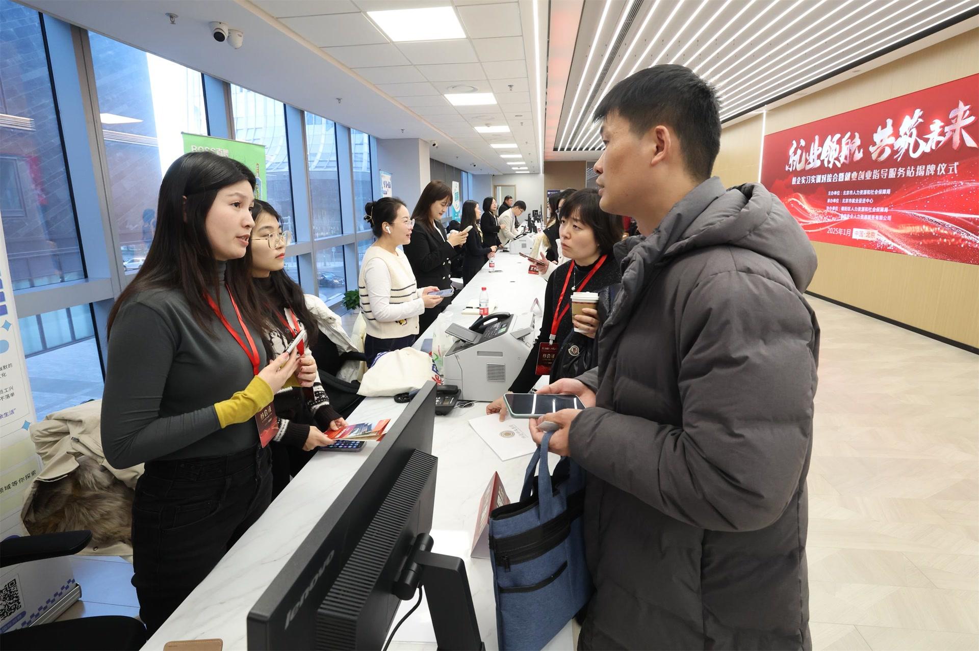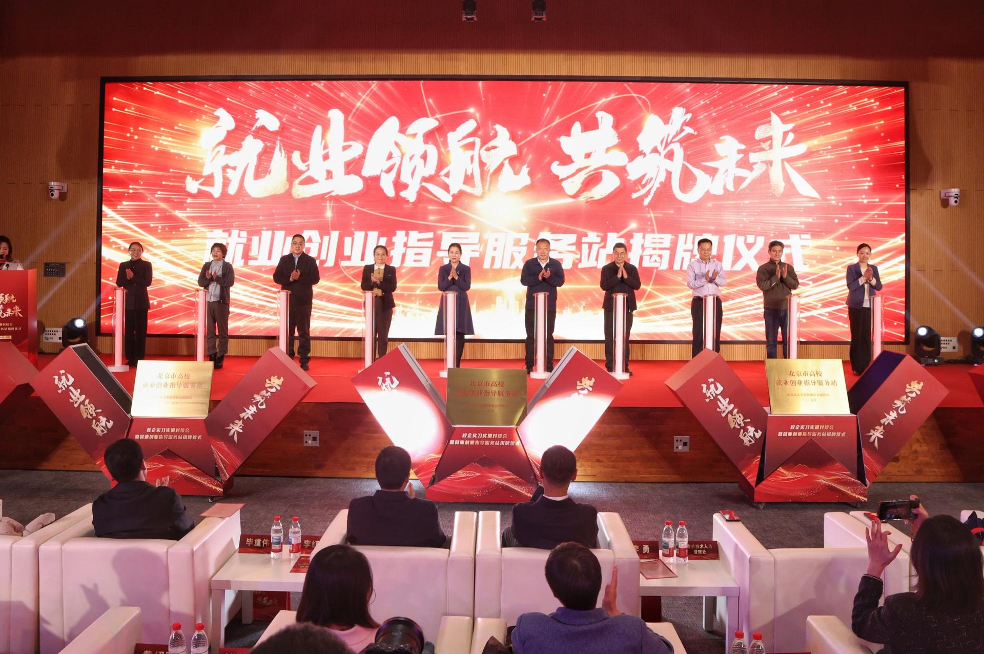 1月3日,北京“就业领航 共筑未来”校企实习实训对接会暨就业创业指导服务站揭牌仪式在朝阳区人力资源产业园举行。北京市人力资源和社会保障局为北京工商大学等5所院校颁授“北京市高校就业创业指导服务站”标牌,首次创新启动高校就业创业指导服务站建设工作。