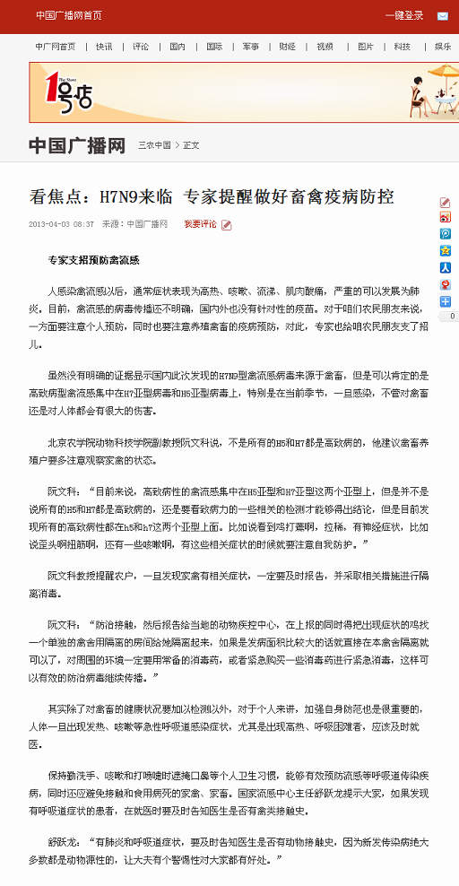看焦点:H7N9来临 专家提醒做好畜禽疫病防控