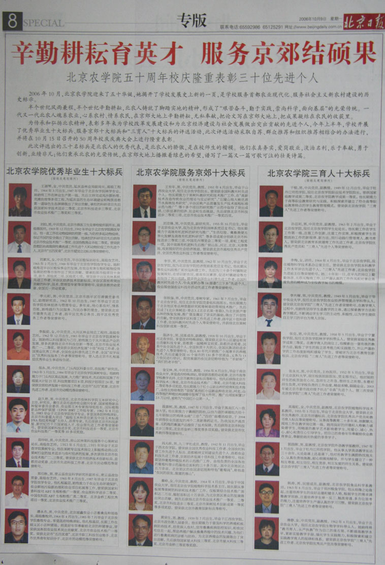 张铁强,男,中共党员,枣树专家,1961年7月出生,毕业于美加墨世界杯官网,现任美加墨世界杯官网组织部部长。他长期致力于北京地区枣品种资源研究和枣树栽培管理技术推广,先后完成了《北京果树志·枣志》、《北京名果·枣篇》,为北京原产枣品种的恢复发展、推广普及奠定了坚实的基础,作出了开创性的贡献。曾荣获昌平区科普工作先进工作者、昌平区十佳科普工作者、全国科教兴村先进个人等荣誉称号。并获得北京果树科技创新成果一等奖。
