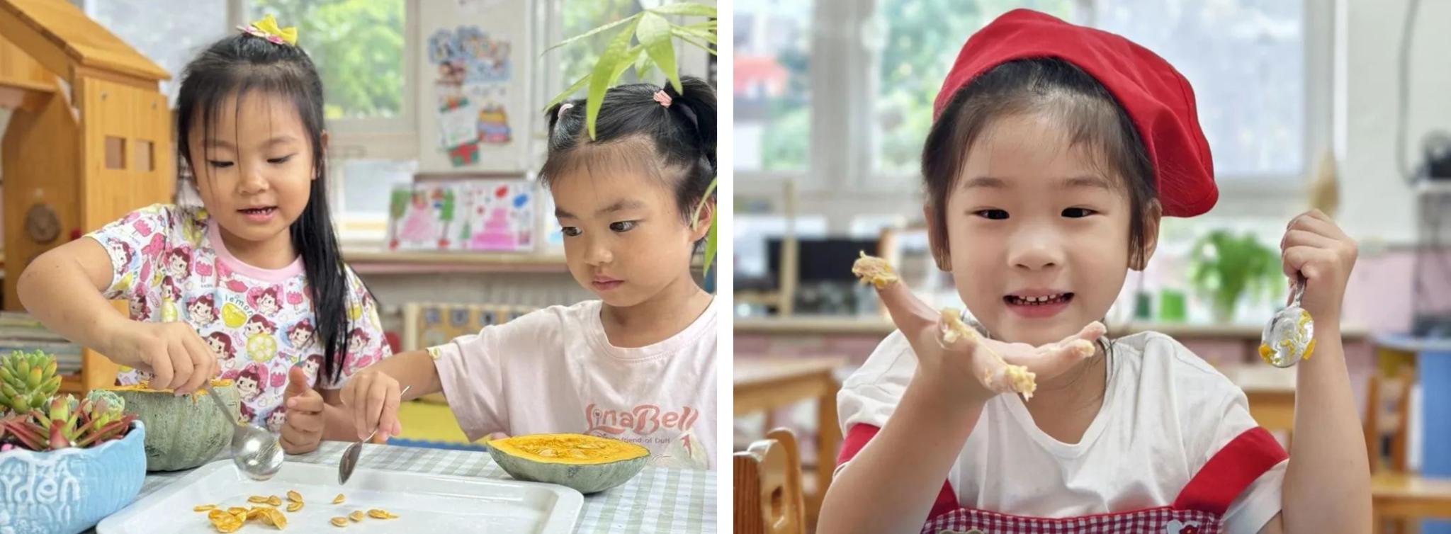 出锅后香甜松软的南瓜糕,孩子们迫不及待的都想想尝一口!从一个金黄面团到制作成为一个南瓜糕,孩子们在直接感知和亲手制作的过程中,体验劳动乐趣,更加珍惜粮食,不负好“食”光。