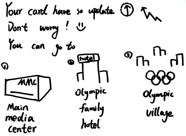 通过调查大型国际赛事的案例资料,他们发现把一些常见问题绘制成图画,是一种很好的辅助交流方式。擅长绘画的王镇韬也自然成了这项工作的主力,他说:“遇到交流不畅时,我们就拿出对应的图画卡片展示给涉奥人员,很多问题马上就迎刃而解了。不少人解决疑问后还会掏出手机对着小卡片拍照纪念呢!”