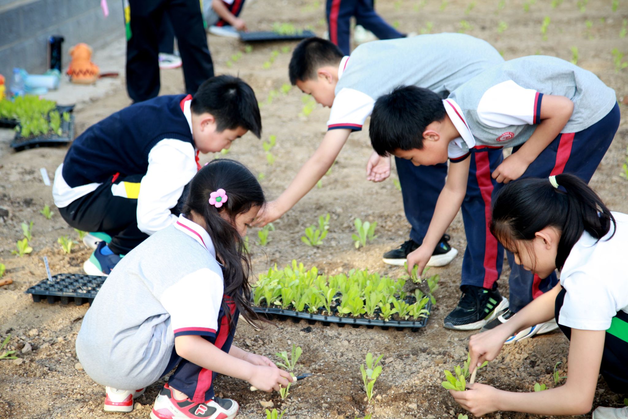 小学生们在栽种菜苗