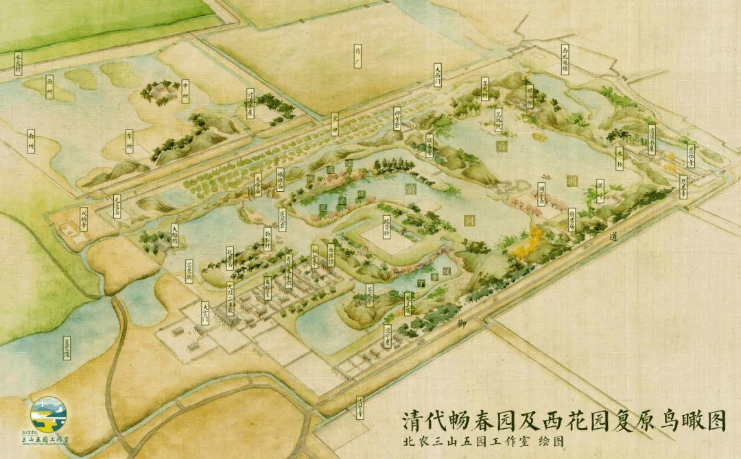 清代畅春园及西花园复原鸟瞰图(朱强团队绘)