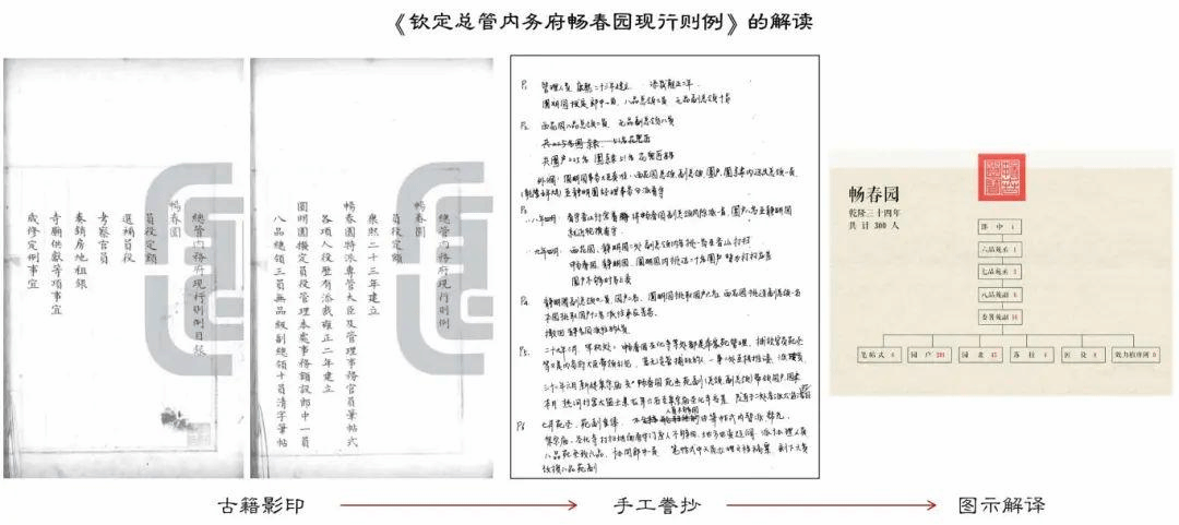《钦定总管内务府畅春园现行则例》的影印本文字非常小,团队就一笔一笔地抄录下来,再进行图示转译,梳理出负责畅春园管理维护人员情况;古人绘制的“样式雷”图档用苏州码子标注建筑群尺寸,就需要团队将苏州码子翻译为阿拉伯数字再进行计算……