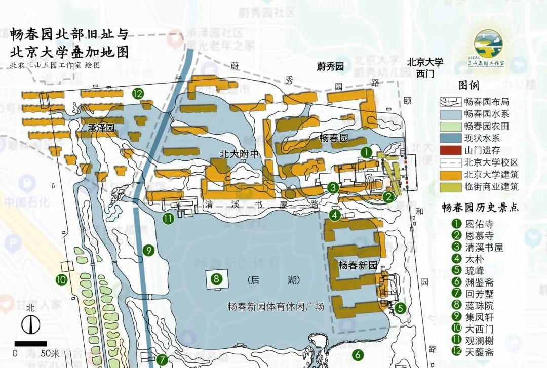 地理位置上,北大与畅春园的北部存在着空间重叠。畅春园的旧址大致在今北四环以北、蔚秀园和承泽园以南、海淀公园路以东、颐和园路以西的区域。颐和园路以东是人们最为熟悉的北京大学燕园校区,而道路的西侧,则是畅春园曾经的土地。2024年,“畅春园”入选了“三山五园传统地名保护名录(第一批)”,与此同时,位于畅春园遗址东北部、北京大学畅春园食堂南侧的“清溪书屋”,以及位于北京大学西门外的畅春园恩佑寺和恩慕寺也成功入选,体现了古园文化基因的坚韧,也反映出北大校园以及周围地区有着深厚的历史底蕴与传统文化气息。
