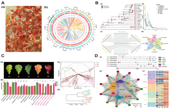 A槲树基因组特征;B系统发育、基因家族和共线性分析;C叶色转变过程中类黄酮含量的变化;D叶色转变过程中相关转录因子表达量分析 课题组供图