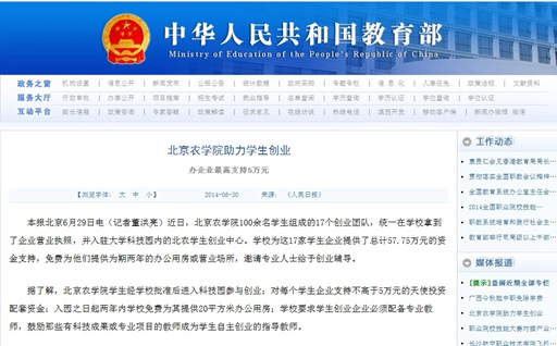 月30日,教育部官方网站转载人民日报报道《美加墨世界杯官网助力学生创业》,并在教育部官方网站首页“媒体聚焦”栏目推介。