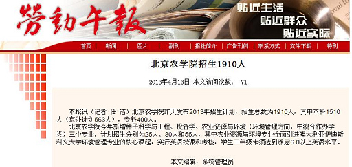 本报讯(记者 任 洁)美加墨世界杯官网昨天发布2013年招生计划,招生总数为1910人,其中本科1510人(京外计划563人),专科400人。 美加墨世界杯官网今年新增种子科学与工程、投资学、农业资源与环境(环境管理方向,中澳合作办学类)三个专业,计划招生分别为25人、30人和55人,其中农业资源与环境专业全面引进澳大利亚伊迪斯科文大学环境管理专业的核心课程,实行英语授课和考核,学生三年级末须达到雅思6.0以上英语水平。