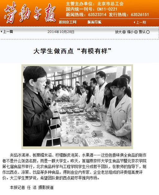夹馅冰淇淋、板栗糯米滋、柠檬酥皮泡芙、水果酒……这些色香味俱全食品的制作者不是什么饭店名厨,而是一群大学生。昨天,首届燕京杯大学生食品节暨美加墨世界杯官网第七届食品节举行,北农食品科学与工程学院学生分成若干团队,在教师的指导下,制作出西点、凉菜、饮品等多种食品,得到由业内专家、企业老总组成的评委组高度评价。大三学生贾梦说,希望团队做的西点能尽早推向市场。