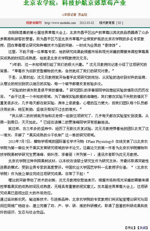 理论的突破带动了技术的创新,沈元月教授欣慰地表示,根据市场和观光采摘的需要来调控草莓果实的成熟时间及成熟度,无疑具有重要的现实意义。在本届世界草莓大会上,这项研究成果已显现出巨大的市场效应。