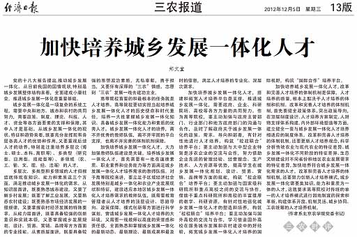 城乡发展一体化是一项复杂的系统工程,需要中央和地方、城市和农村的共同努力,需要政策、制度、理论、科技、人才、资金等各方面要素的支撑和保障,其中人才是基础。从城乡发展一体化的现状、特征和趋势来看,既要充分发挥现有各层各类人才的优势和作用,又要重视后续人才的培养,特别是注重培养多层次(博士、硕士、本科、高职等)、多类型(研究型、应用型、技能型等)、多领域(农、工、管、文、理、经、法等)的人才。