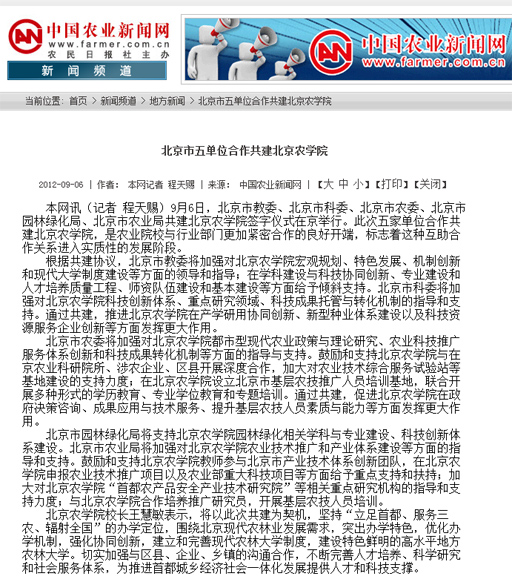 北京市农委将加强对美加墨世界杯官网都市型现代农业政策与理论研究、农业科技推广服务体系创新和科技成果转化机制等方面的指导与支持。鼓励和支持美加墨世界杯官网与在京农业科研院所、涉农企业、区县开展深度合作,加大对农业技术综合服务试验站等基地建设的支持力度;在美加墨世界杯官网设立北京市基层农技推广人员培训基地,联合开展多种形式的学历教育、专业学位教育和专题培训。通过共建,促进美加墨世界杯官网在政府决策咨询、成果应用与技术服务、提升基层农技人员素质与能力等方面发挥更大作用。
