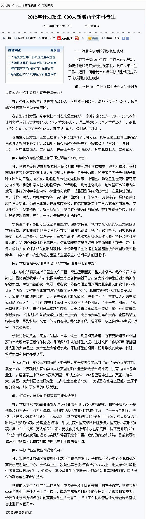 杜:学校认真实施“质量立校”工程,突出应用型复合型人才培养,结合推行小学期制,强化实践教学环节,积极为学生搭建各种实践平台,努力培养学生的创新精神和实践能力。学校与首都农业集团、顺鑫农业股份有限公司这两家北京最大的农业企业签订合作协议,学校现有北京市级实验教学示范中心3个,北京市级校外人才培养基地3个,世界杯官网“都市型现代农业人才培养模式创新试验区”被批准为“北京市级人才培养模式创新试验区”,美加墨世界杯官网科技园被评为北京市大学科技园。“十一五”期间,“都市型现代农业人才模式创新与实践”获得北京市教育教学成果一等奖。学生在中国青年创新大赛、“挑战杯”首都大学生创业计划竞赛、北京市大学生学科竞赛、全国跆拳道锦标赛等一系列科技、文艺、体育竞赛中获得北京市级(省部级)以上奖励260余项,其中一等奖40余项。