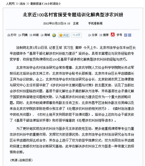 法制网北京3月23日讯 记者王斌 实习生 黄晔 今天上午,北京市法学会在丰台区长辛店镇举办“基层干部化解涉农纠纷能力建设”培训会。具有丰富理论与实务经验的专家学者、政府官员和律师向近100名基层干部讲授化解典型涉农纠纷的经验与技巧。