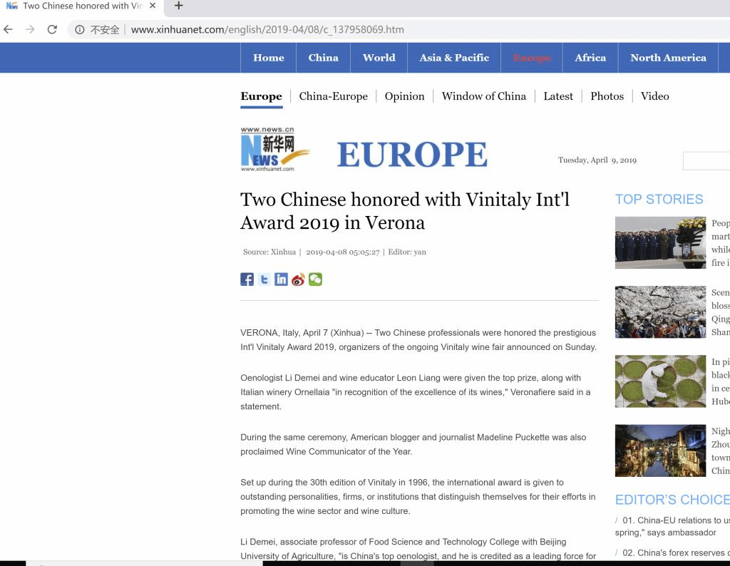 VERONA, Italy, April 7 (Xinhua) -- Two Chinese professionals were honored the prestigious Int'l Vinitaly Award 2019, organizers of the ongoing Vinitaly wine fair announced on Sunday.
