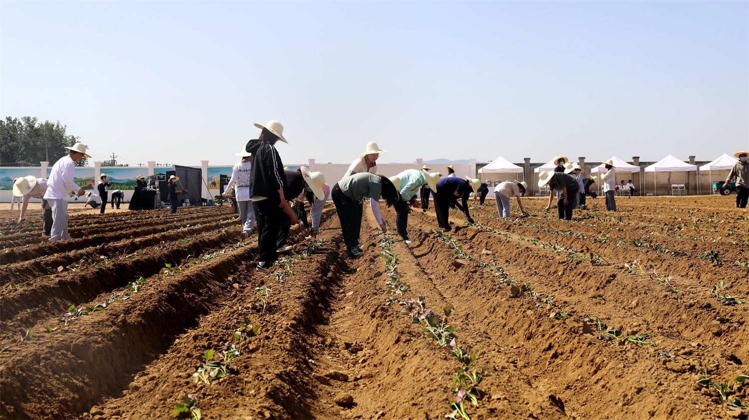 启耕仪式后,全体校领导与300余名师生一起走进田间地头进行劳动实践,与师生一起边劳作、边探讨各种农作物的生长习性、种植方式及技巧。虽然天气炎热,但广大师生有序分工、紧密协作,不怕苦、不怕累,田间地头呈现出一片热火朝天的农耕景象,在30余亩土地上种上了北农师生团队自主研发的红薯、花生、鲜食玉米和向日葵等作物品种。