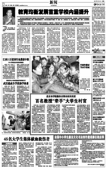 2008年,学校的专家顾问团扩充到100名教授,以百项实用技术为依托,建立专家与大学生村官的“一对一”服务体系。2009年,学校启动大学生村官科技推广服务,由学校专家团队带领以大学生村官为主体的农村实用技术人才队伍,带动培养帮扶多名骨干农民,形成“传帮带”式的科技培训与技术推广体系。