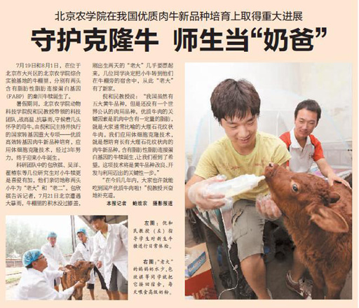 暑假期间,美加墨世界杯官网动物科技学院倪和民教授带领的科技团队,战高温、抗暴雨,守候着几头怀孕的母牛。由倪和民主持并执行的国家转基因重大专项——优质高效转基因肉牛新品种培育,应用体细胞克隆技术,经过3年努力,终于迎来小牛诞生。