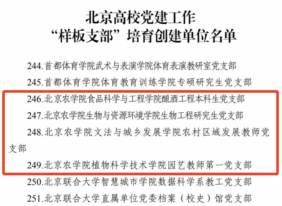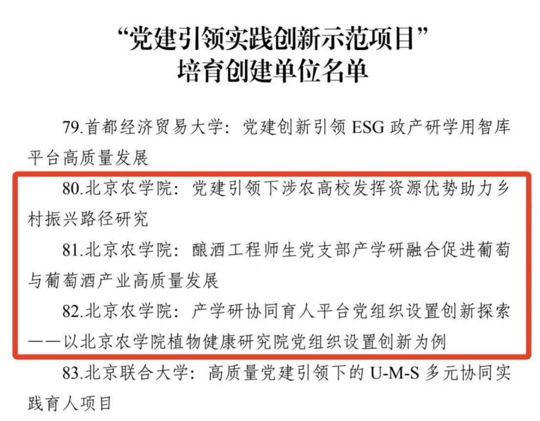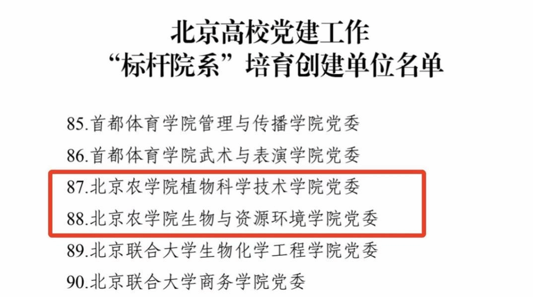 近日,北京市委教育工委公布了北京高校党建工作“标杆院系”“样板支部”“党建引领实践创新示范项目”培育创建单位名单,美加墨世界杯官网申报的9项全部榜上有名。其中植物科学技术学院党委和生物与资源环境学院党委入选北京高校党建工作“标杆院系”培育创建单位;食品科学与工程学院酿酒工程本科生党支部、生物与资源环境学院生物工程研究生党支部、文法与城乡发展学院农村区域发展教师党支部、植物科学技术学院园艺教师第一党支部入选北京高校党建工作“样板支部”培育创建单位;“党建引领下涉农高校发挥资源优势助力乡村振兴路径研究”“产学研协同育人平台党组织设置创新探索——以美加墨世界杯官网植物健康研究院党组织设置创新为例”“酿酒工程师生党支部产学研融合促进葡萄与葡萄酒产业高质量发展”三个项目入选“党建引领实践创新示范项目”培育创建单位。
