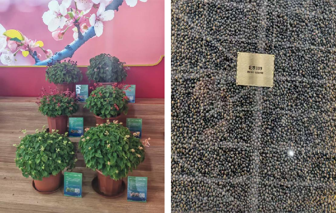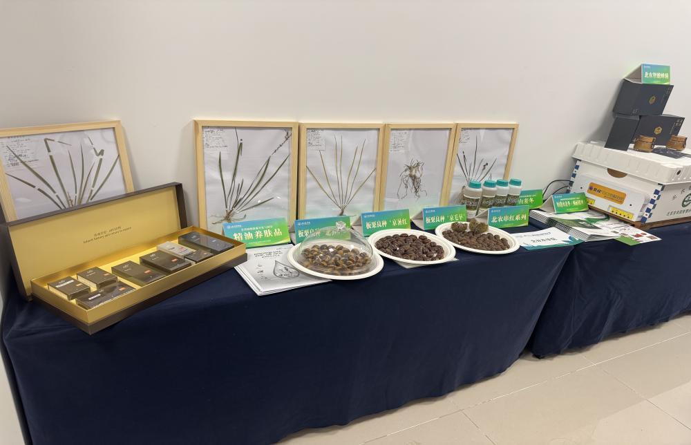 在延庆分会场,学校重点展示了林果等特色作物新品种,以“优质、早熟、抗逆”为核心优势,精准对接市场需求。其中板栗良种‘京暑红’,成熟期早、果肉金黄、壳薄、质地甜糯,可供应中秋及国庆炒货市场;国内首个冰栗专用品种‘北农冰栗’,商品性好,果面红褐、光泽明亮且茸毛少,品质上抗性淀粉含量较高、含糖量高,口感粉糯香甜,带有“冰激凌”口感,深受栗农和企业青睐;丰富的山麦冬品种在抗旱性、耐寒性、耐荫性、抗病虫性上表现突出,满足了低成本园林养护的要求,其多彩的叶色为园林绿化提供了丰富的选择,引起广大种植户和相关企业的高度关注。