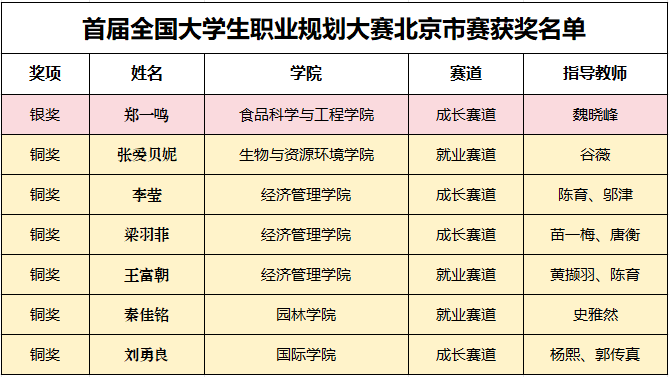 近日,北京市教育委员会公布首届全国大学生职业规划大赛北京市赛评比结果。经过激烈角逐,世界杯官网共有7名同学获奖,其中银奖1项,铜奖6项。