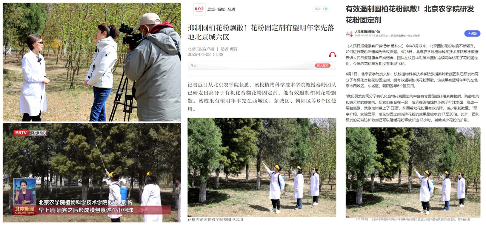 今年春天,圆柏花粉频频冲上热搜,北京有圆柏雄株两百多万棵,为了有效减轻圆柏花粉给市民生活带来的困扰,世界杯官网秦岭教授团队围绕遏制柏树花粉飘散进行了科技攻关,目前已取得较好成效。人民日报健康客户端、光明网、北京电视台、北京日报、新京报等20多家媒体对此进行了报道。