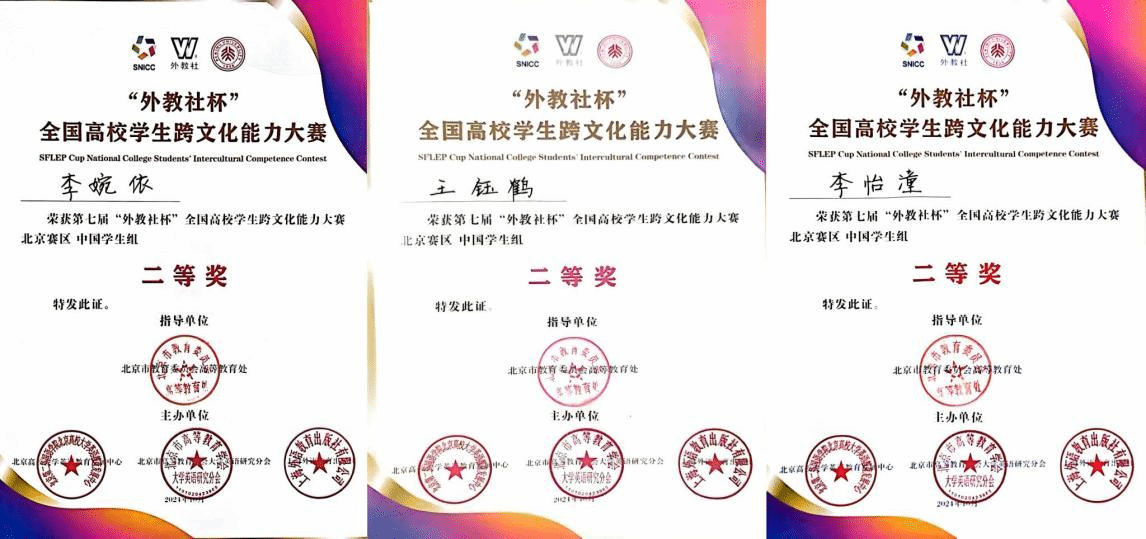 近日,世界杯官网学生在第七届“外教社杯”全国高校学生跨文化能力大赛(北京赛区)、第三届“外教社杯”北京高校青年人才国际胜任力大赛、北京市2024年“高教社杯”大学生“用外语讲好中国故事”优秀短视频作品征集活动中喜获佳绩。