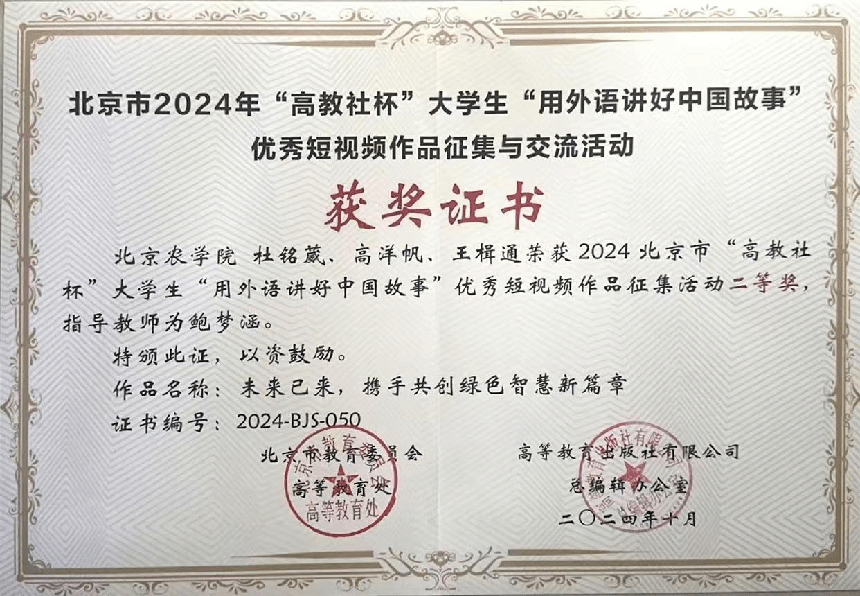 在北京市2024年“高教社杯”大学生“用外语讲好中国故事”优秀短视频作品征集与交流活动中,世界杯官网园林学院鲍梦涵老师指导的杜铭葳、高洋帆、王楫通三位同学完成的作品“未来已来,携手共创绿色智慧新篇章”获得二等奖。