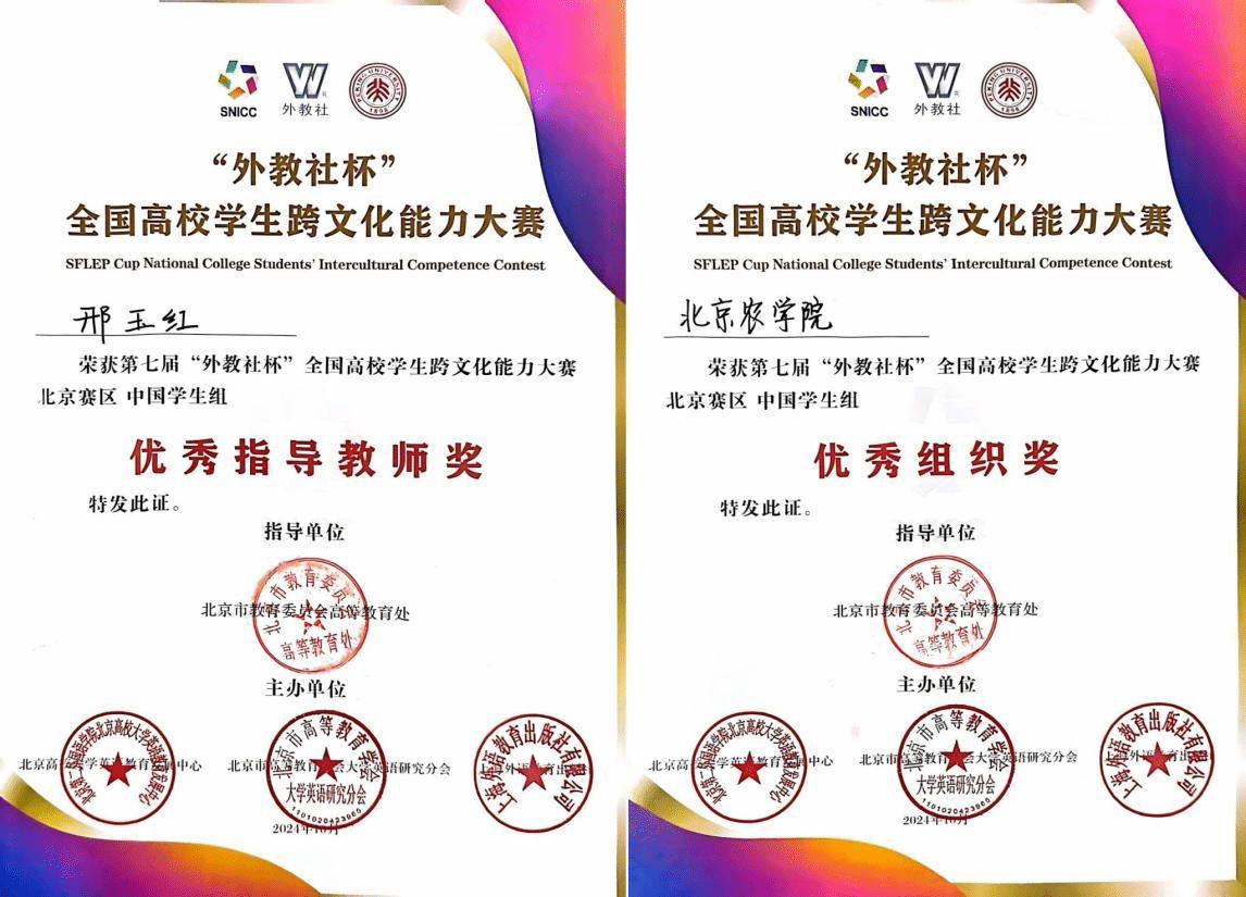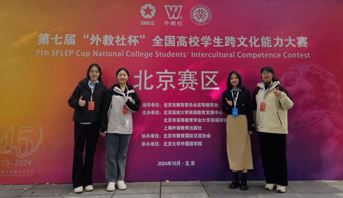 第七届“外教社杯”全国高校学生跨文化能力大赛(北京赛区)决赛在北京大学举行。世界杯官网文法与城乡发展学院王钰鹤、国际学院李婉依、李怡潼三位同学组成的跨文化竞赛团队,斩获北京赛区二等奖,取得了世界杯官网学生参加此项大赛以来的最好成绩。外语教学部邢玉红老师获优秀指导教师奖,学校荣获优秀组织奖。