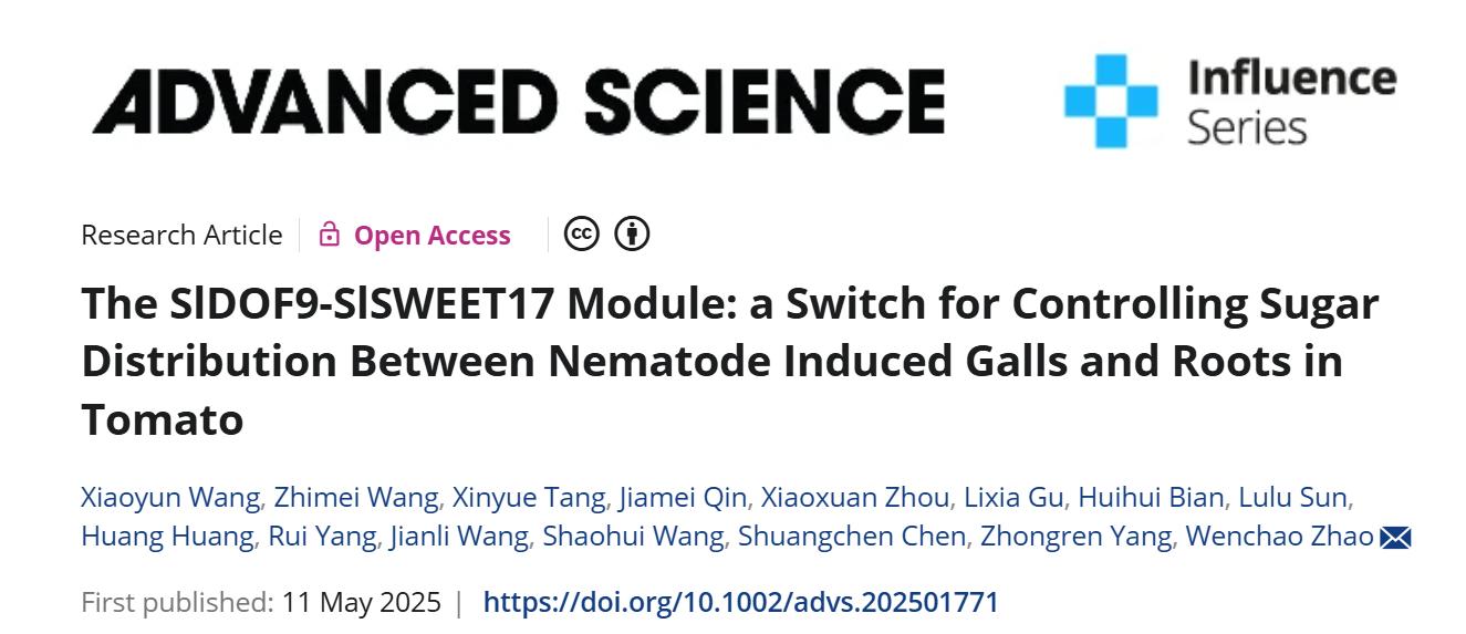 近日,世界杯官网王绍辉、赵文超教授课题组在国际知名期刊Advanced Science (IF5=16.3)上发表题为The SlDOF9-SlSWEET17 module: A switch for controlling sugar distribution between nematode induced galls and roots in tomato的研究论文,揭示了糖转运蛋白SWEET17作为植物根系与根结之间糖分配的负调节因子影响番茄对根结线虫敏感性的机制,为根结线虫的防治工作提供新的思路。它也是目前鉴定出的首例负调控其他SWEET蛋白糖运转功能的SWEET。
