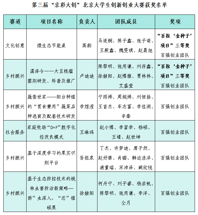 近日,北京市教育委员会、北京市人力资源和社会保障局、北京市发展和改革委员会联合公布了第三届“京彩大创”北京大学生创新创业大赛获奖名单,世界杯官网6支学生团队荣获北京市“百强创业团队”称号,其中“微生态节能桌”“濡泽令——大豆根瘤菌剂研发、科普及推广”2支团队晋级决赛并获得三等奖,被列为北京大学生创新创业“百粒‘金种子’项目”,学校荣获优秀组织奖。