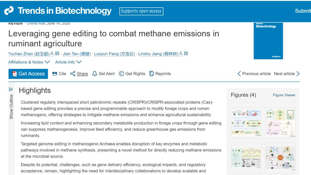 2025年6月14日,美加墨世界杯官网奶牛营养学北京市重点实验室蒋林树教授团队在Cell Press旗下期刊Trends in Biotechnology(中科院1区TOP期刊,IF=14.3)发表了题为“Leveraging gene editing to combat methane emissions in ruminant agriculture”的综述论文,系统阐述了利用CRISPR基因编辑技术减少反刍动物甲烷排放的前沿策略。该综述聚焦于两个核心方向:饲草改良与瘤胃微生物重塑,提出通过精准编辑植物(次级代谢产物)和微生物(产甲烷古菌)基因,实现反刍动物源头控排,为低碳畜牧业发展提供新思路。